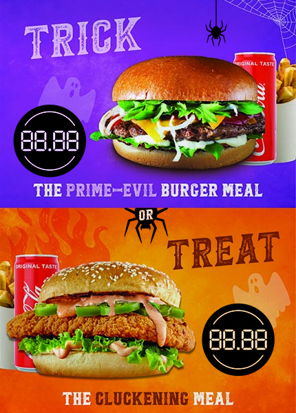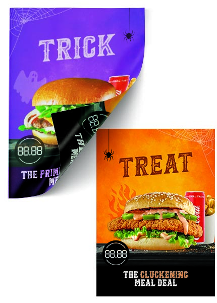 Double sided Trick or Treat meal deal poster. Order Now